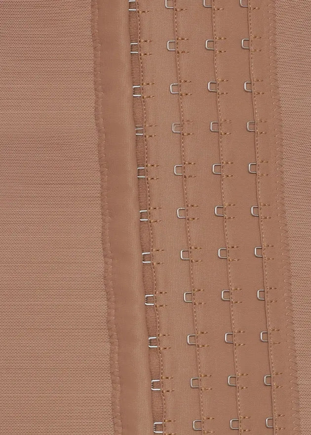 Faja enterizo levanta cola, moldea la cintura, la cadera y la pierna. Realiza el busto con tiras ajustables. cuenta con una abertura con panty en la zona intima y encaje siliconado para un mejor agarre. Con 4 niveles de broche para un ajuste superior, compression alta. Color Moca